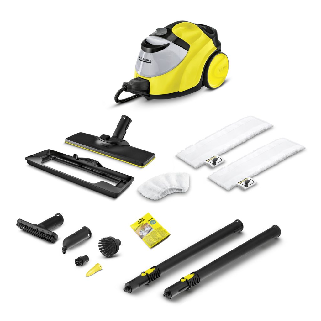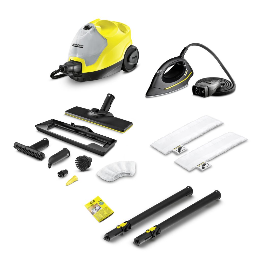 2.3m steam hose - gun with steam flow regulation and childproof safety lock, EasyFix floor nozzle with flexible joint, 2 x 0.5m extenstion tubes, Microfibre cloth for floor kit - 2 pieces, Microfibre cover for hand tool - 1 piece, Hand tool, Detail nozzle, Round brush - black - 1 piece, Round brush (large), Power nozzle, Carpet glider, Removable filler tank for easy refilling, Decalcifying powder, EasyFinish steam pressure iron.