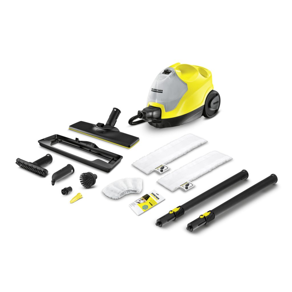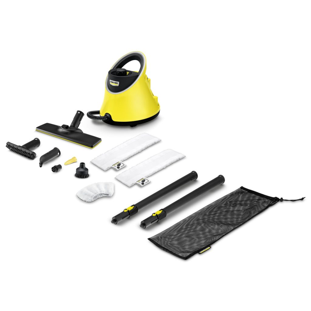 2.3m steam hose - gun with steam flow regulation and childproof safety lock, EasyFix floor nozzle with flexible joint, 2 x 0.5m extenstion tubes, Microfibre cloth for floor kit - 2 pieces, Microfibre cover for hand tool - 1 piece, Hand tool, Detail nozzle, Round brush - black - 1 piece, Round brush (large), Power nozzle, Carpet glider, Removable filler tank for easy refilling.