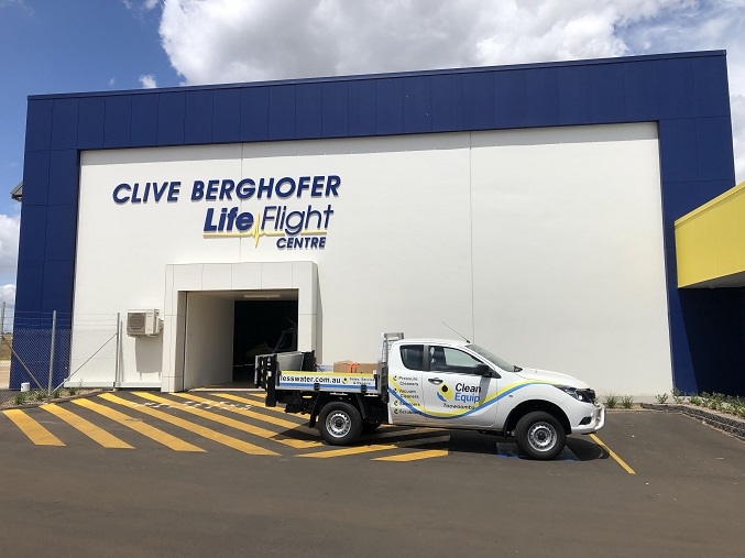 Cleanequip was approached by the staff at RACQ LifeFlight Rescue Toowoomba in July 2018 with the need for assistance with their washing procedure of the helicopters based at the Toowoomba airport. They explained that high pressure water/air can damage helicopter components and electrical wiring, so each helicopter is hand washed on a regular basis. Their issue is the pooling of the water runoff on the ground around the helicopter when finished. They were also very excited to be moving into their new multi-million dollar base that was being built at the Toowoomba airport and once completed, there was a need for the supply of cleaning equipment to keep this facility looking like new.