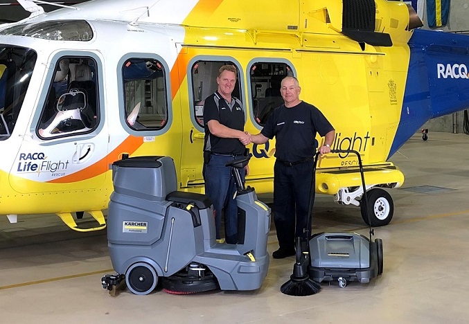 Cleanequip is also honoured to support the work of RACQ LifeFlight Rescue service by supplying a Karcher BD 50/70 R Bp Classic ride-on floor scrubber and a KM 70/20 C floor sweeper for use at the new hangar. The ride-on floor scrubber is ideal to negotiate the area around the helicopter and remove the water runoff due to it’s high degree of manoeuvrability and agility, quickly providing a safe working environment. The 70 litre waste water tank will allow for the total collection of the runoff without the need for stopping. One of the main attractions to these machines by LifeFlight was the ease of use of both models, as they have various people required to operate each machine. Both machines were delivered to the new hangar this week and Mike Smit was very keen to put them to use. He said currently they use an air blower for quick cleans and it is very dusty. “Not only will the floor sweeper solve this issue, to be able to quickly get the machine and not having to worry about fueling/starting a motor or charging batteries and knowing it is always ready for use – no matter how large or small the job – is a major benefit”.