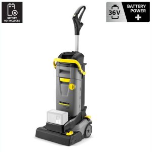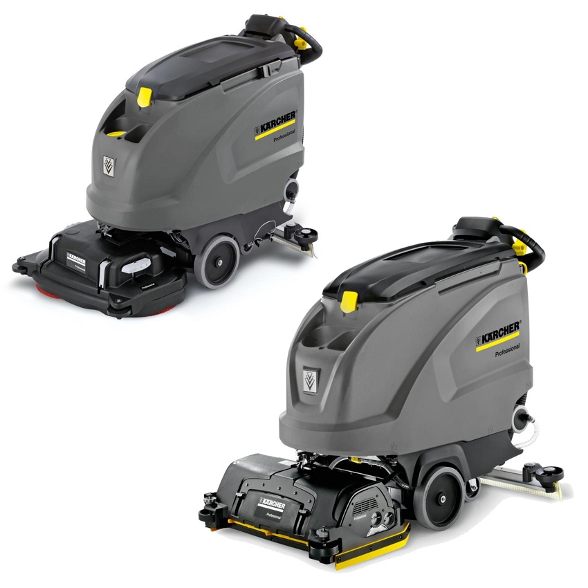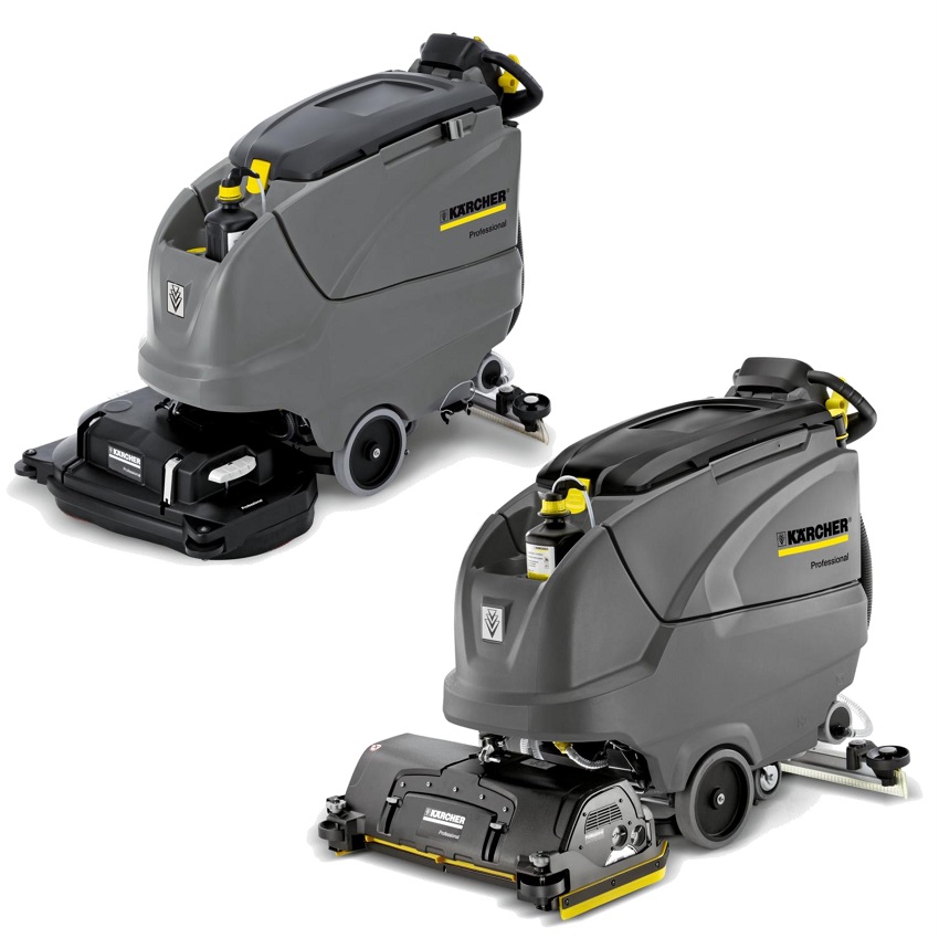 Standard disc/roller brushes (depending on version of brush head ordered), curved squeegee, 2 tank system, height adjustable seat, standard daytime driving light, robust front bumper, speed-dependent water dosing, Karcher Intelligent Key (KIK) system, built-in battery charger, maintenance-free batteries.